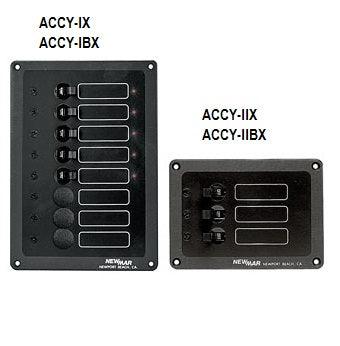 Half-height version of ACCY-IX at left. 3 breaker capacity, 3 installed standard; 3 DC ?ON? indicator lights installed standard - AC optional. 1-5A, 1-10A 1-15A or specify. Size: 3 3/4" x 5 1/4", Weight: 1 lb.